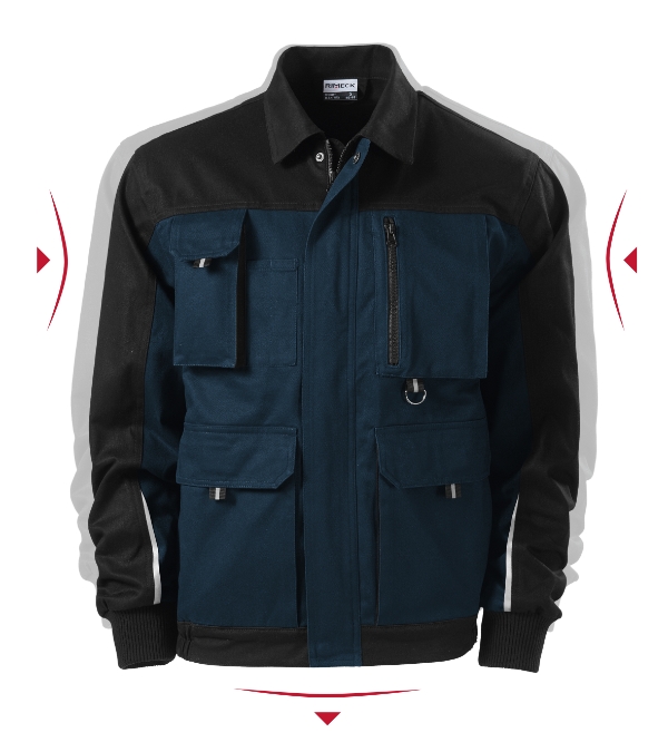 full-length molded zipper with flap, folds on the back part, 8 multifunctional pockets, bellow pockets with flap and welt zip pockets, rib knit sleeve cuffs with 3 % elastane, the lower side hem with elastic band, metal D-ring and carabiner for keys and ID cards, double stitching for extra durability, retroreflective elements