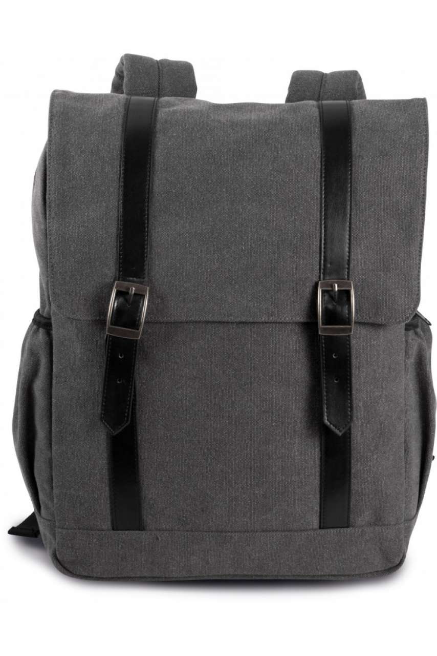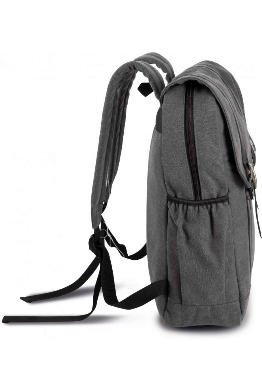 Cotton canvas backpack with flap top;Contrast straps with press stud closure concealed under decorative metal buckles;Padded inside zipped compartment to fit tablets or up to 13" laptops;Padded ergonomic shoulder straps and back;