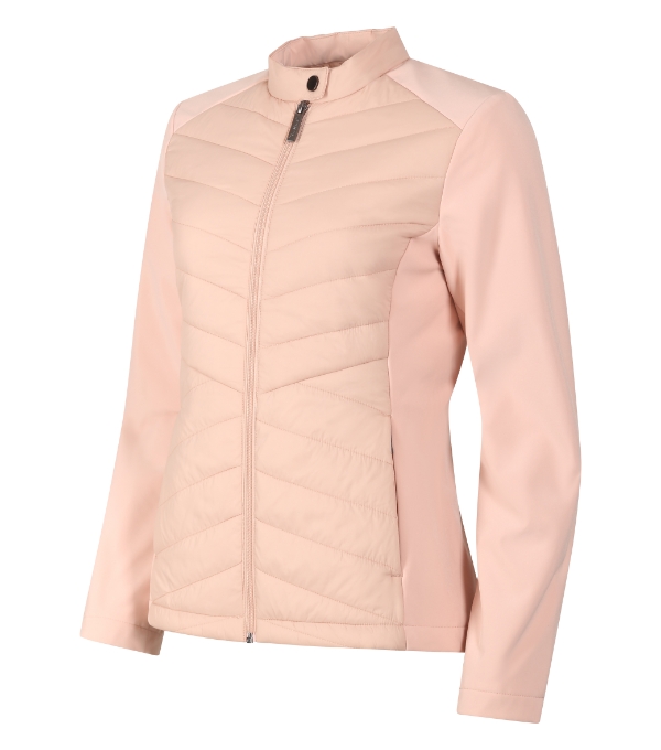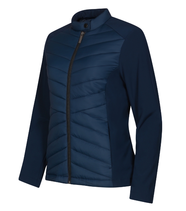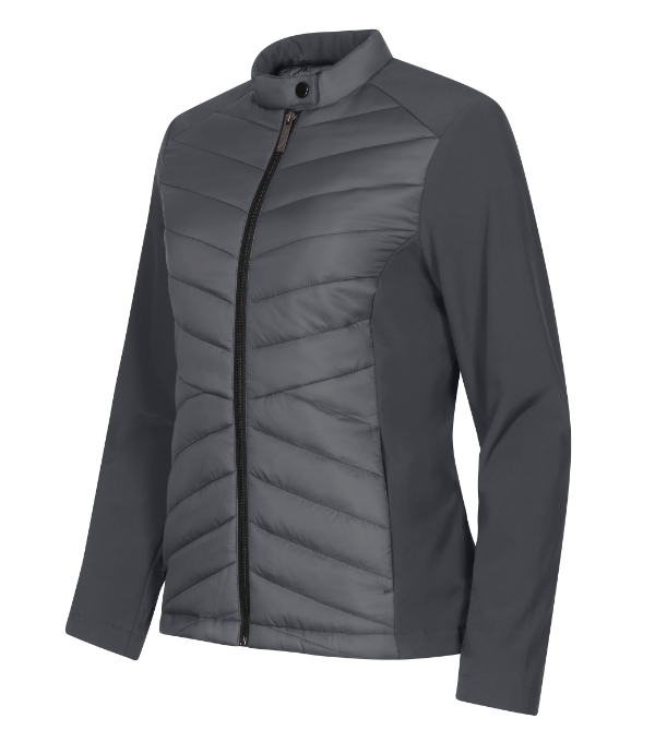 combination of quilted and softshell fabric, cut fitted by side parts, stand up collar with snap button, full-length coil zipper, side pockets with coil zipper, inner breast zip pocket , access for branding in back lining