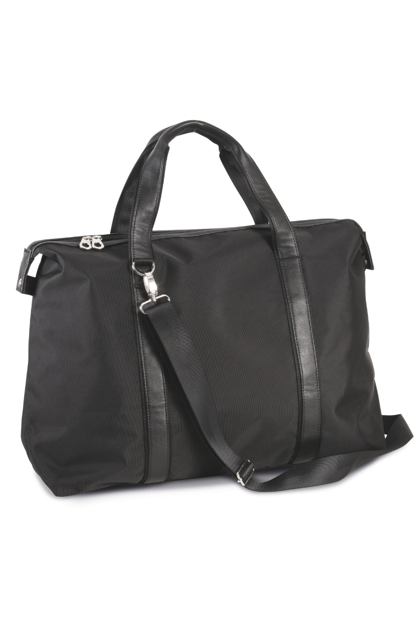 900D polyester holdall travel bag with contrast trimming along top zip closure;210D polyester lining;Contrast handle and straps with webbing reinforcement;Detachable webbing shoulder strap;Stabiliser feet;