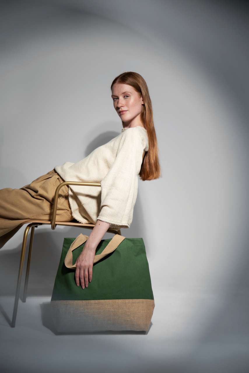 Large hold-all cotton bag with constrast laminated natural jute base;Zipped inner pocket;Gusset;55 cm cotton handles;Magnetic press stud fastening;